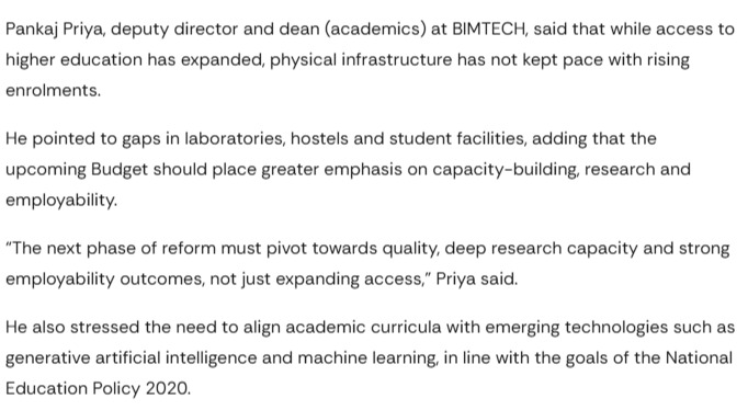 Dr. Pankaj Priya, Deputy Director, Dean Academics Quote| Budget 2026 Education Experts Urge Government to Improve Quality Boost Infra Call to Shift Focus on Skills | |